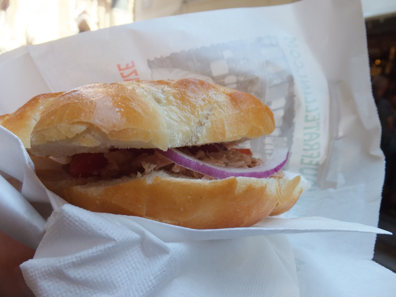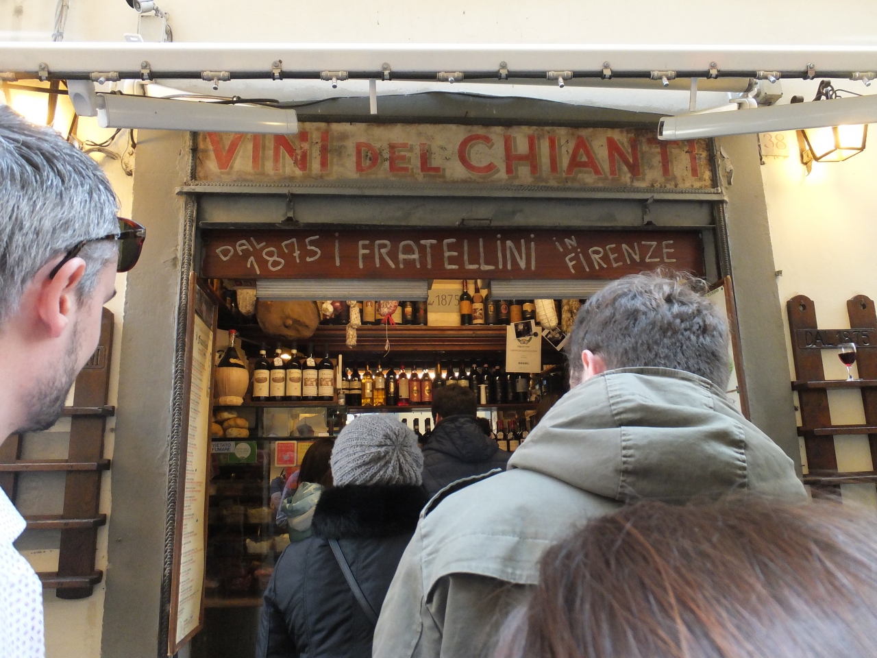 フィレンツェの街をブラブラしていたら、行列ができていたこの店を見かけ、購入してみました。パニーニはどれも3ユーロ。ワインをつけても5ユーロです。店員さんの手際がよく、列はできていましたがあまり待たされることはありませんでした。日本語のメニューが店頭に掲げられてますので、安心です。