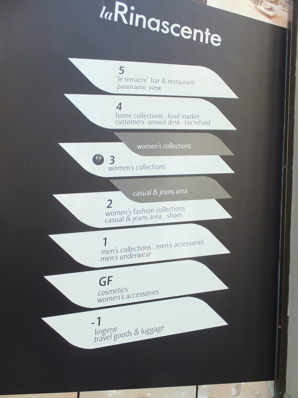 レプッブリカ広場にある百貨店。それほど広くない敷地ですが、化粧品から紳士服、婦人服まで、一通りのブランドが揃っています。個人的には、5階のキッチン用品売り場がお気に入りです。きれいな色のキッチン用品が多く、見ているだけで楽しい気分になります。