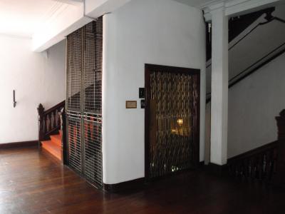 歴史を感じさせる外装と内装、手動扉が付いたエレベーターが新鮮。