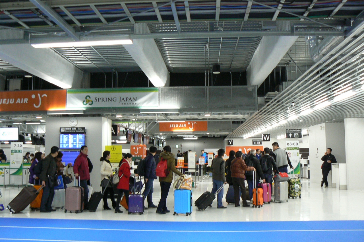 初めて成田第3ターミナルを利用するので不安でしたが第2ターミナルからは歩いてそれほどかかりませんでした。ただ、その日雨が降って寒かったので、外を歩くのに凍えましたが…。第3ターミナルに入るとすぐ春秋航空の長い列が目に飛び込んできて、2時間前には着いたけど大丈夫?って思いました。長い列に並ぶとそのうち係りの人が「個人」と言うプレートを持って廻ってきたので声をかけると短い列に行けたのでそれほどかからずチェックイン終了。奥の方に本屋さんとかショップがあり、突き当りにフードコートがあります。韓国の「caffe bene」とかいくつか入っていて結構にぎわっていました。横の椅子では横になっている人も何人かいました。施設は新しくて綺麗でした。