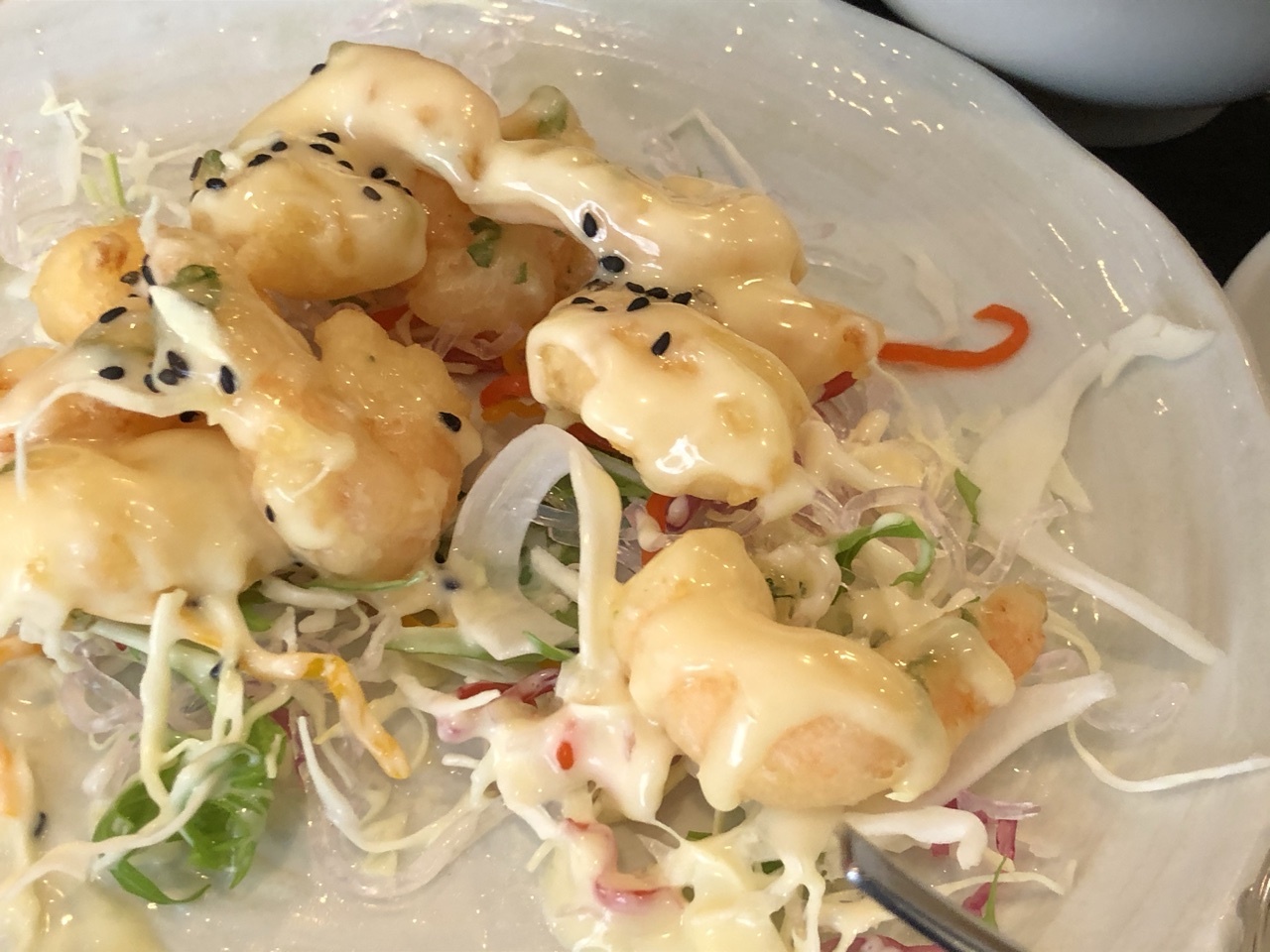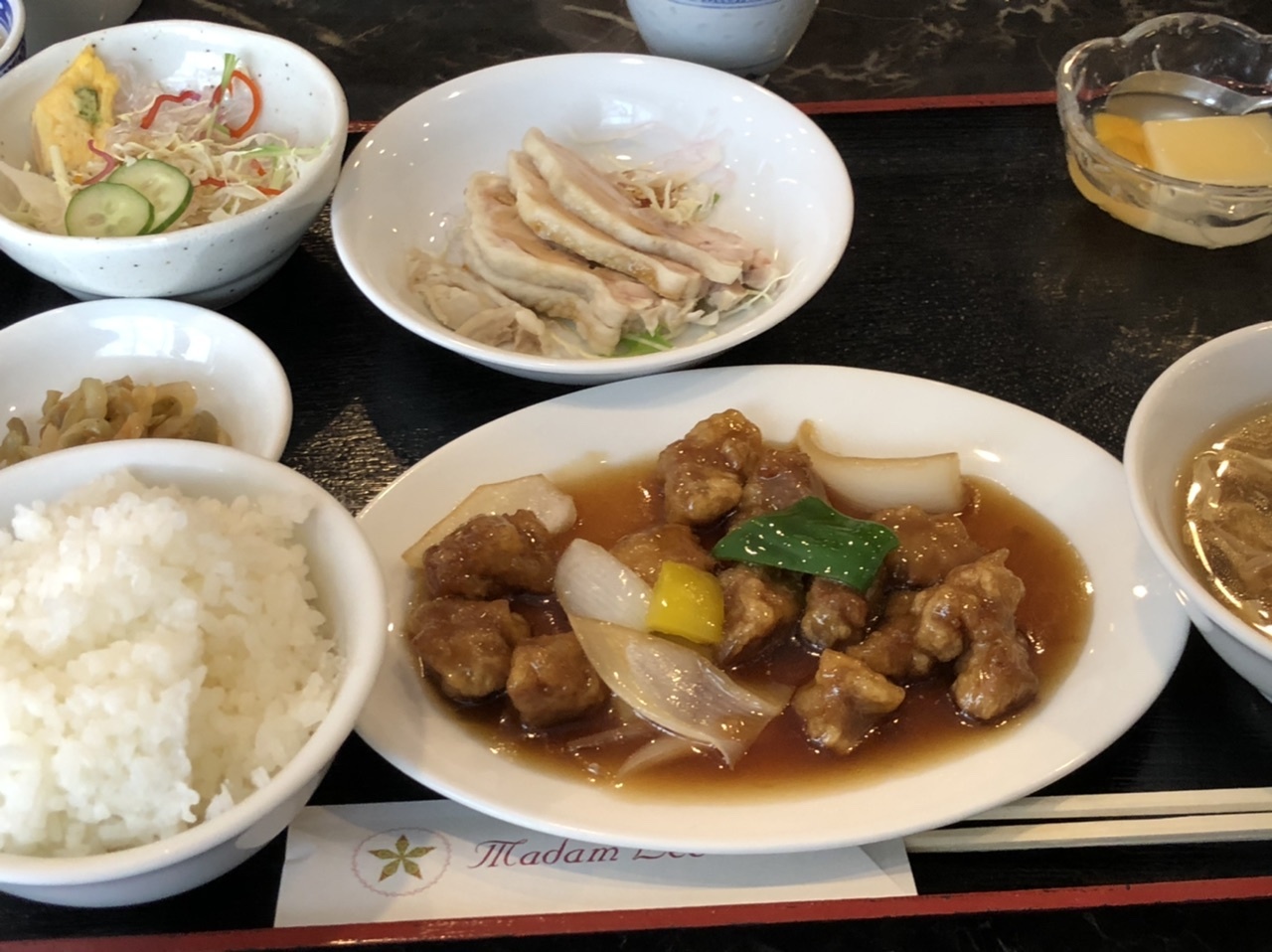 本日のランチはエビマヨ、酢豚、鳥唐揚げの3種からメインに合わせ副菜が少し違う。酢豚には豚まん、エビマヨには蒸し鶏。スープとデザートもついて980円。ご飯かお粥が