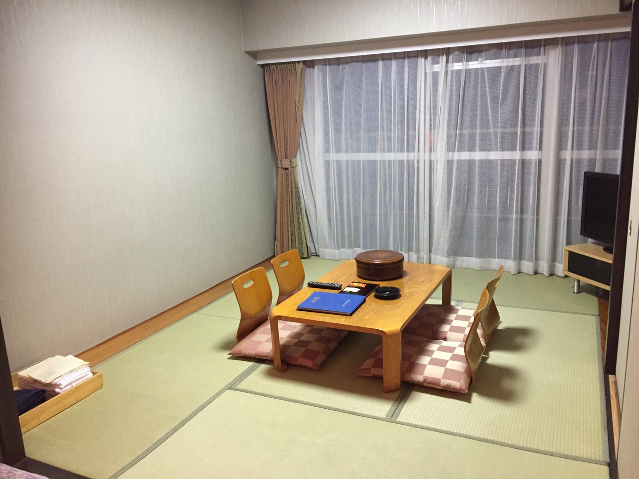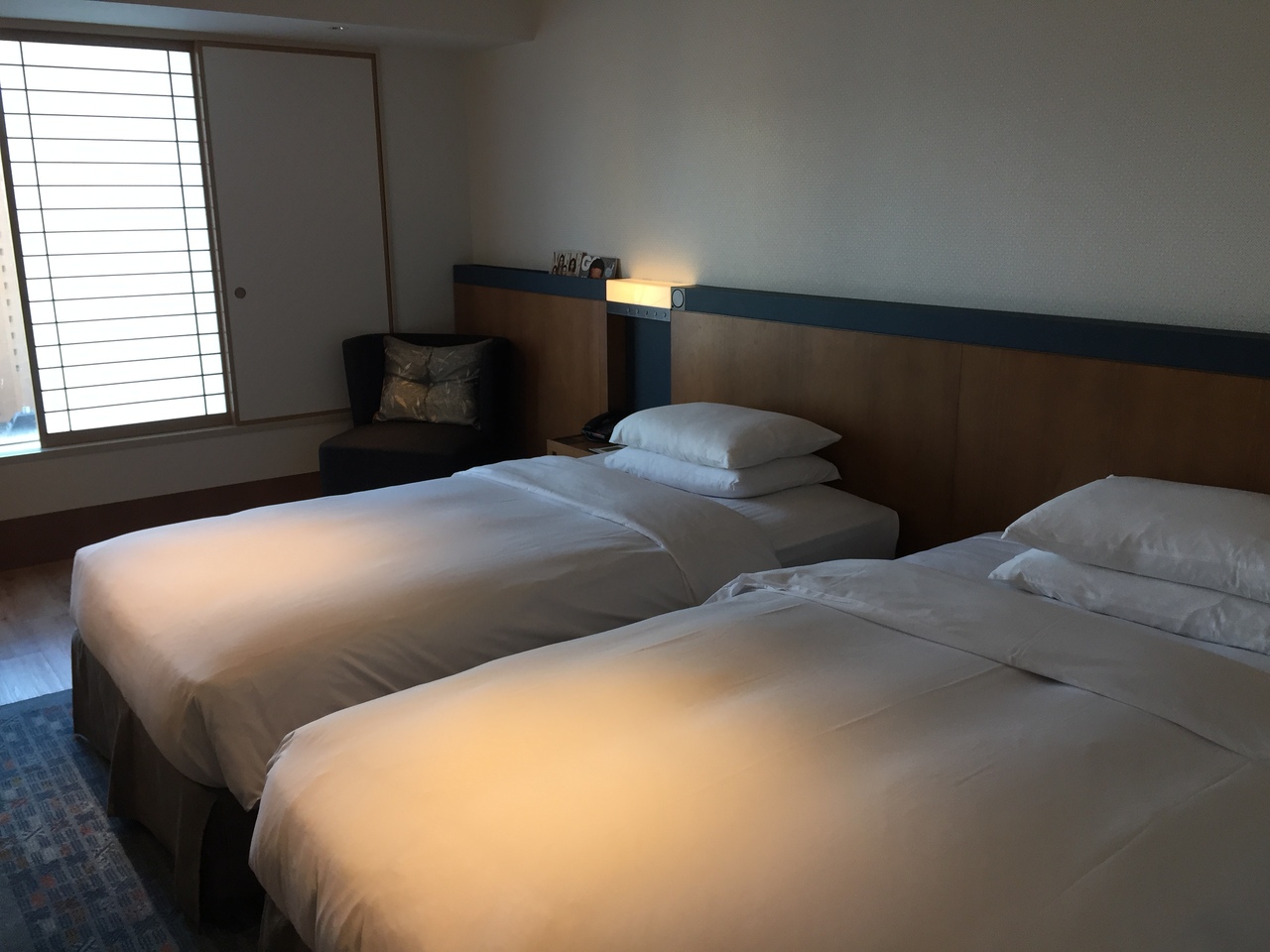 チェックインもスムーズに14階の客室に通された。部屋の床はフローリングで壁と統一された色使い。窓にカーテンはなく障子と襖が使われている。ベッドも柔らかく温度調整もよくされていて、とても落ち着いて過ごすことができる。ホテル内での食事は多少価格が高いけれども、周りに食事処が多くある。ゆっくりとホテルで過ごすにはいいところだと思う。
