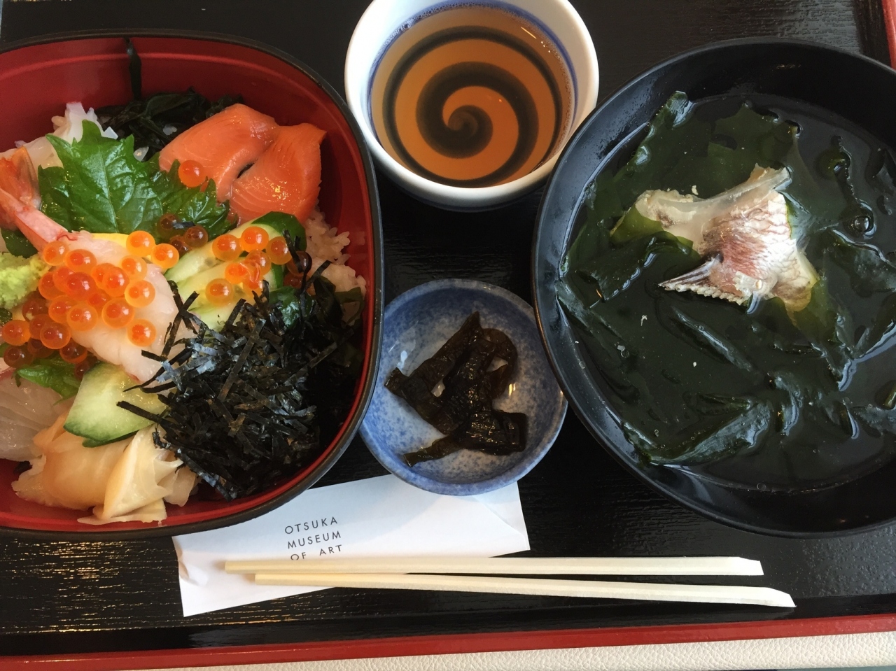 大塚美術館の中、1Fのレストランガーデン。11:00の開店と同時に入り窓ぎわの席をお願いする。目当ては海鮮丼。シャケ、イクラ、イカ、タイに鳴門わかめが絶妙のバランス。ツレはじゃがイモとミートボールのグラタン。寒い時期なので美味しい。どちらもお値段以上。