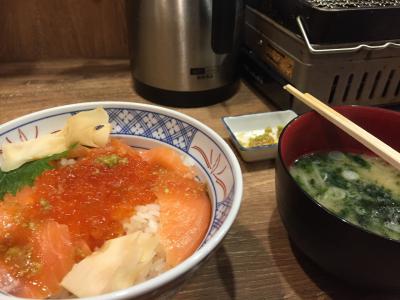 お馴染み全国展開の海鮮焼きの店。早い時間にお昼を食べる。軽くサーモンイクラの親子丼と生海苔の味噌汁。サーモンが薄い以外は、味噌汁の風味もしっかりとイクラもたっぷり。コスパが良い。サーモンは兎も角お姉さんの対応良くて⭐️四つ。