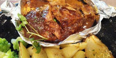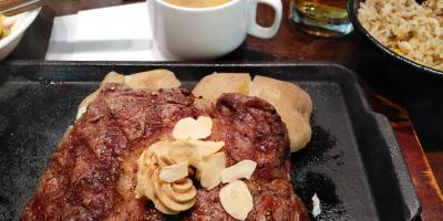 メニューからトップリブステーキコースの300gをオーダー。サラダ、スープ、ガーリックライス、デザート
