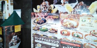 ハンバーグにパイナップルのトッピングのランチプレート、キノコのスープ、コーヒーにストロベリーパフェ。