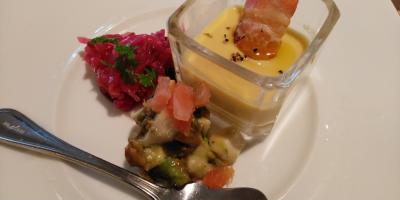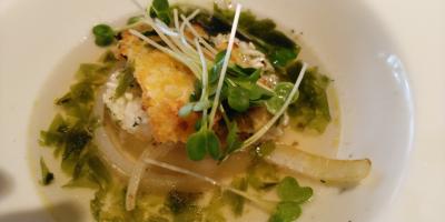 スープはクラムチャウダー、プリメロは鯵のリゾット、