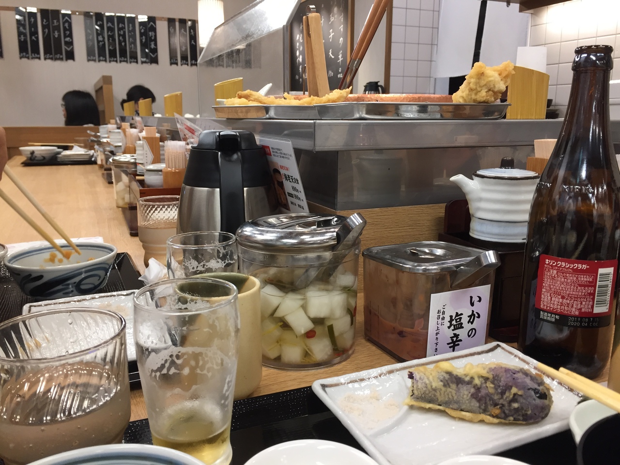 アルコールはキリンラガー中瓶、日本酒一合のみ。あくまで天ぷらを美味しく手軽に素早くがコンセプトの店だ。