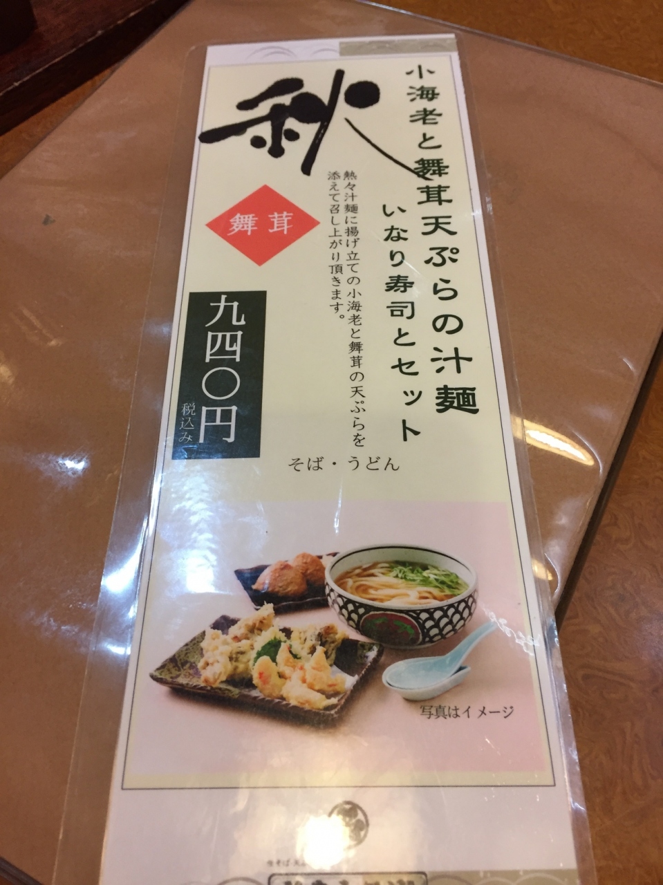 舞茸と海老の天ぷらがついて、暖かい蕎麦。