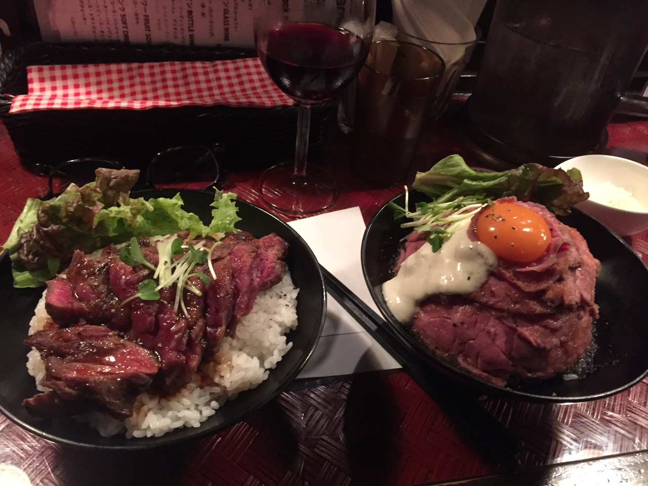 ローストビーフ丼が一押し。ステーキ丼と食べ比べてみた。赤ワインはグラスで480円とエキストラホースラディッシュ50円は美味しく頂く必須アイテム。ビーフはUSビーフ。- 旅行時期