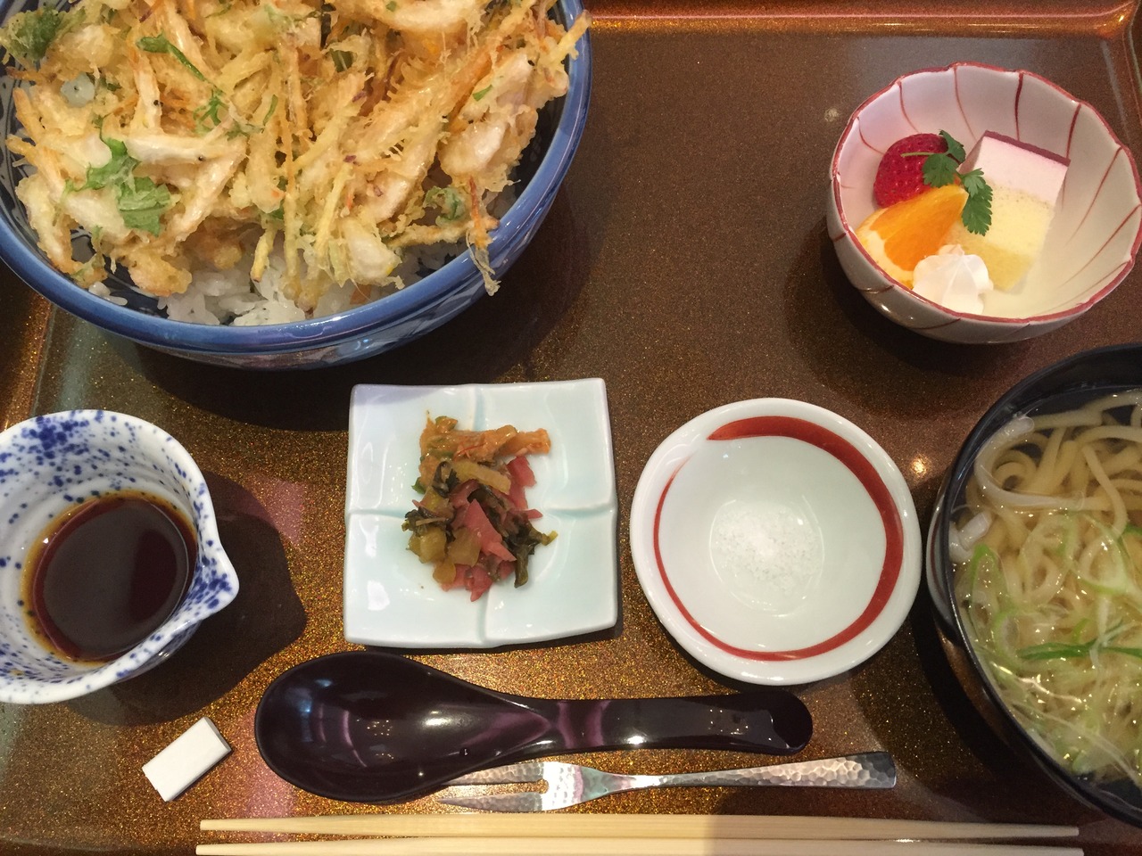 白海老のかき揚げ丼は小さなおうどん、茶碗蒸し、小鉢、デザートまで付いている。