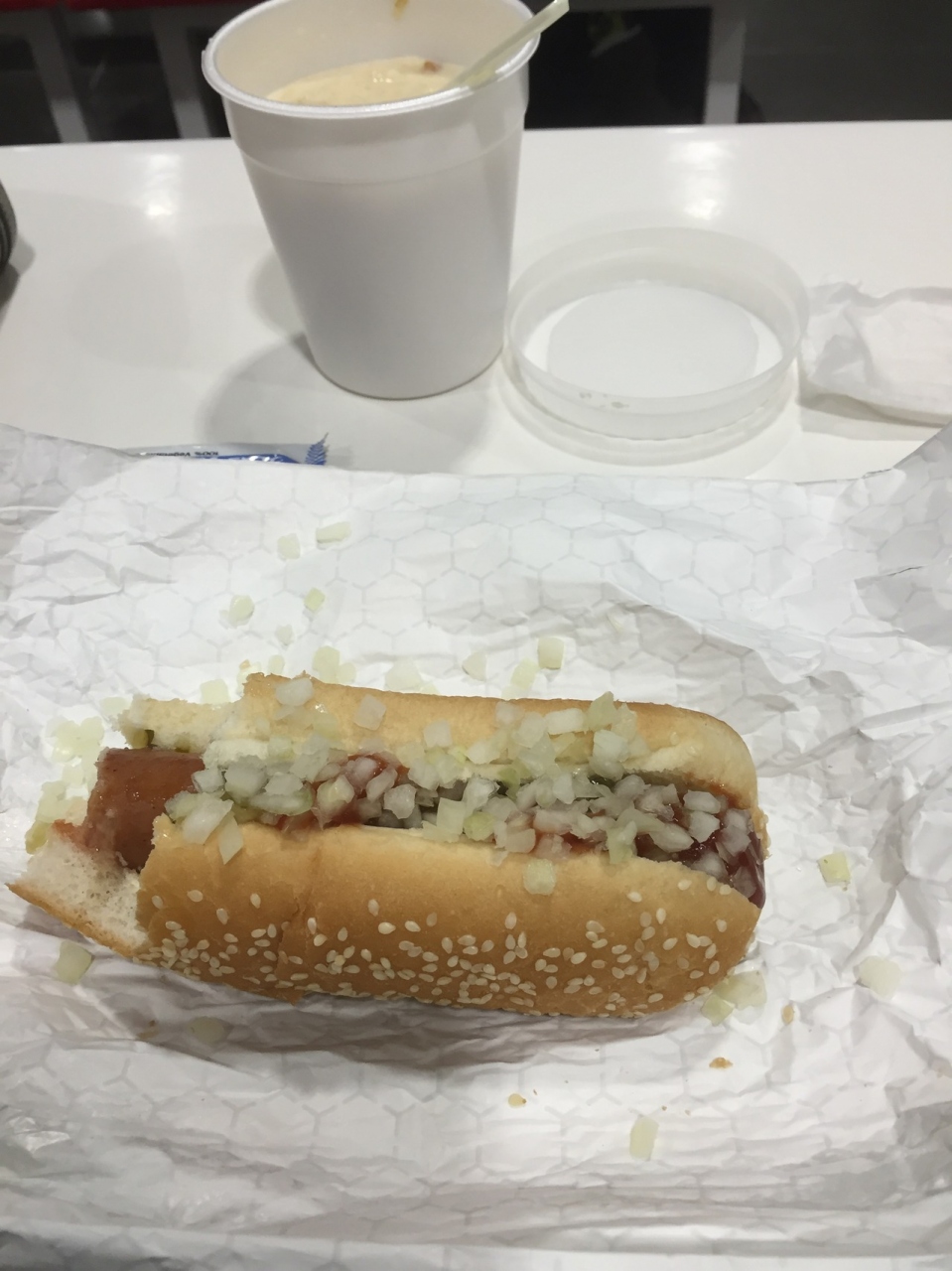 年末近くで買い物客で店内は混み合うものの、ホットドッグやピザのイートインは比較的空いていた。