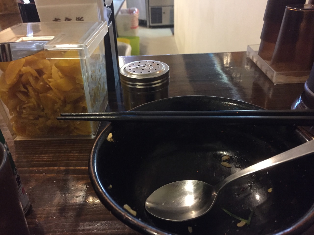 それは、後日検証するとして、ラーメンは並、大、特大、スープはこってり、あっさり、そしてその中間の屋台味。こってりは背脂のこってりでは無く、白味噌雑煮を思い出すトロトロスープだ。中太麺に濃厚なスープが絡んでなかなかよろしい。次回は醤油ベースのあっさりにする予定。- 旅行時期