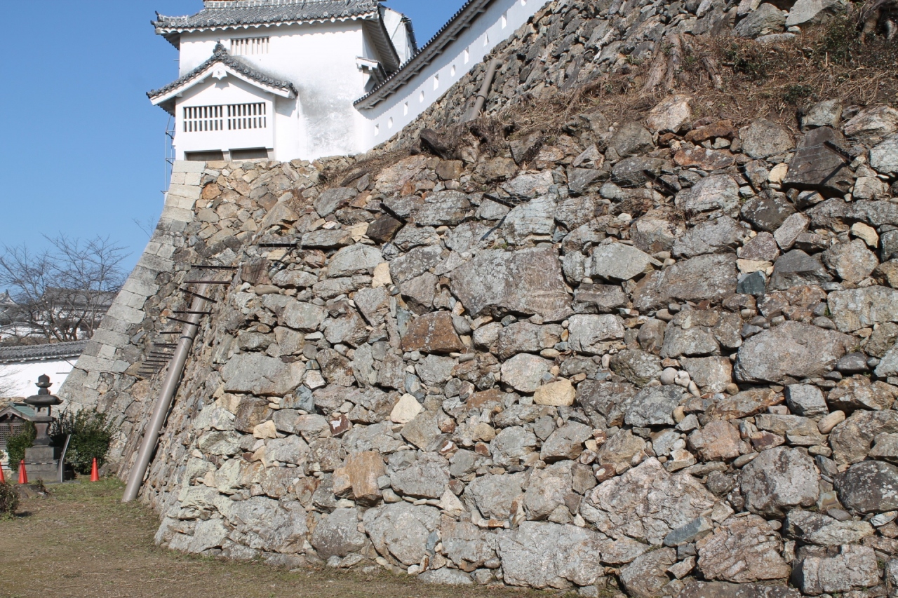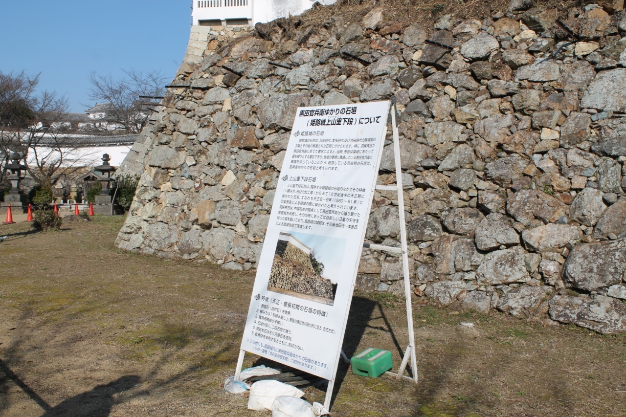 普通城の石垣は成形がされていつものだけれど、この黒田官兵衛ゆかりの石垣の面白いところははほとんど自然石で組まれているということだ。さらに大きな石と石の隙間は、これを間詰め石と言われるものだが、これが河原の石が使われていることだ。いっけんの価値はあると思う。