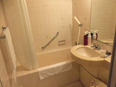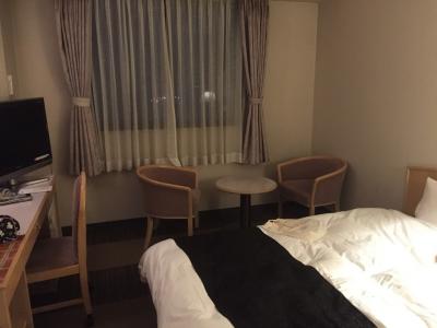 部屋はツインルーム。ベッドはクィーンサイズでゆったり。この程度のビジネスホテルではかなり部屋のサイズに余裕がある。