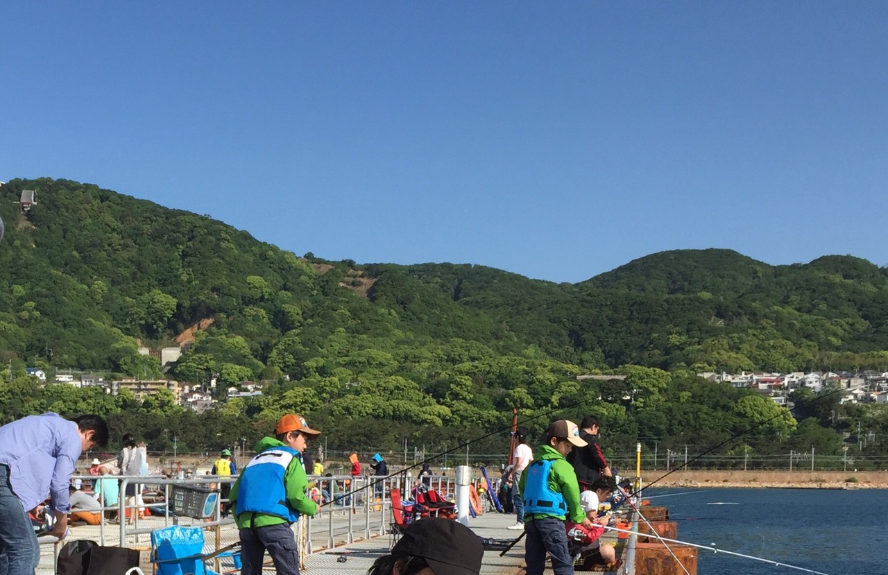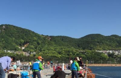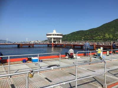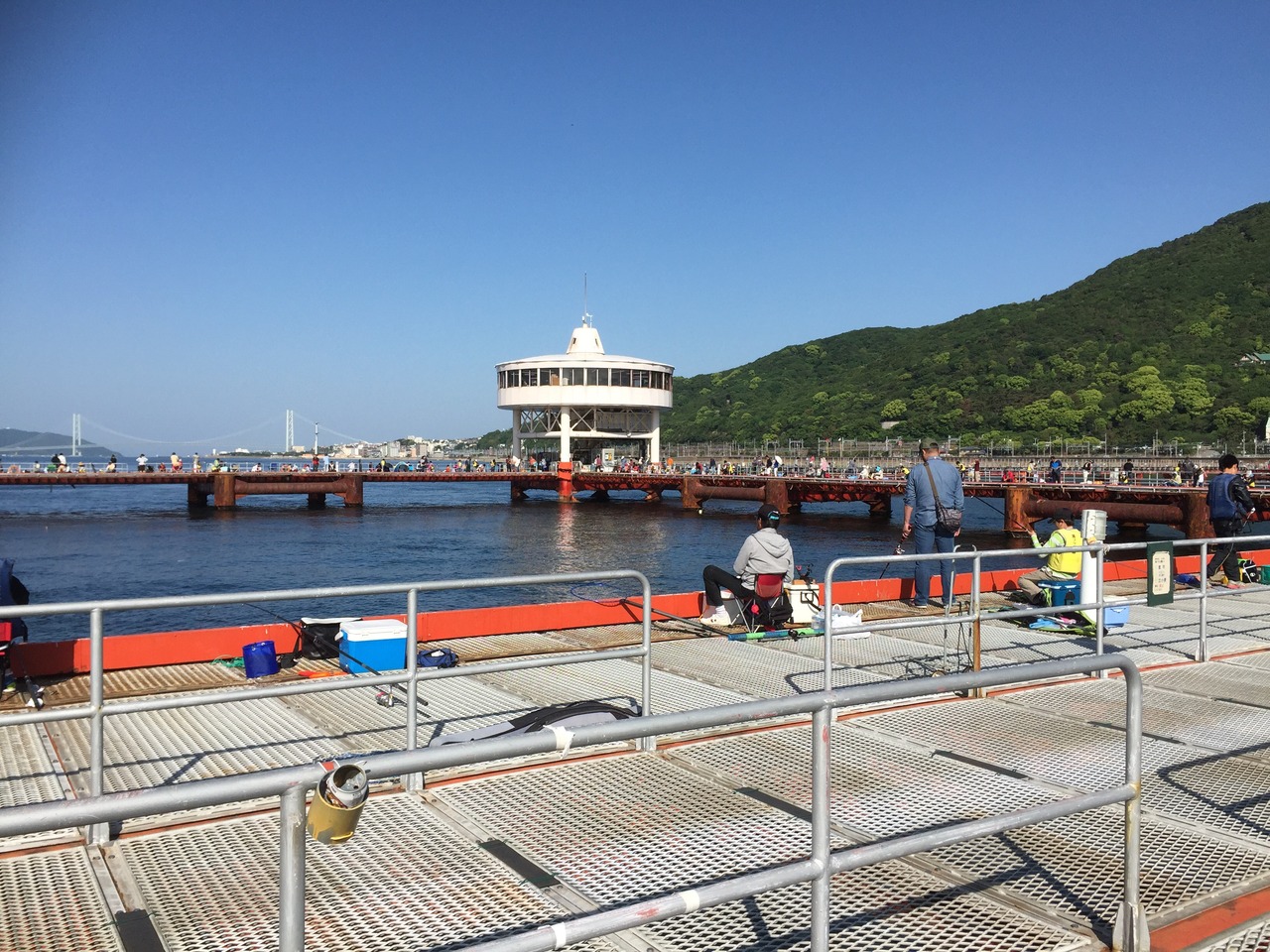 五月五日の子供の日は10:00頃には入場制限。沖に向かって伸びる釣り台は鋼鉄網目越しに海面が見えます。