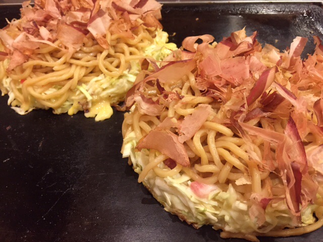 三人で牛スジネギ玉モダン、豚モダン、キムチ焼きそば大、ネギ塩焼きそば大、と