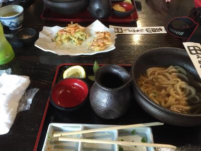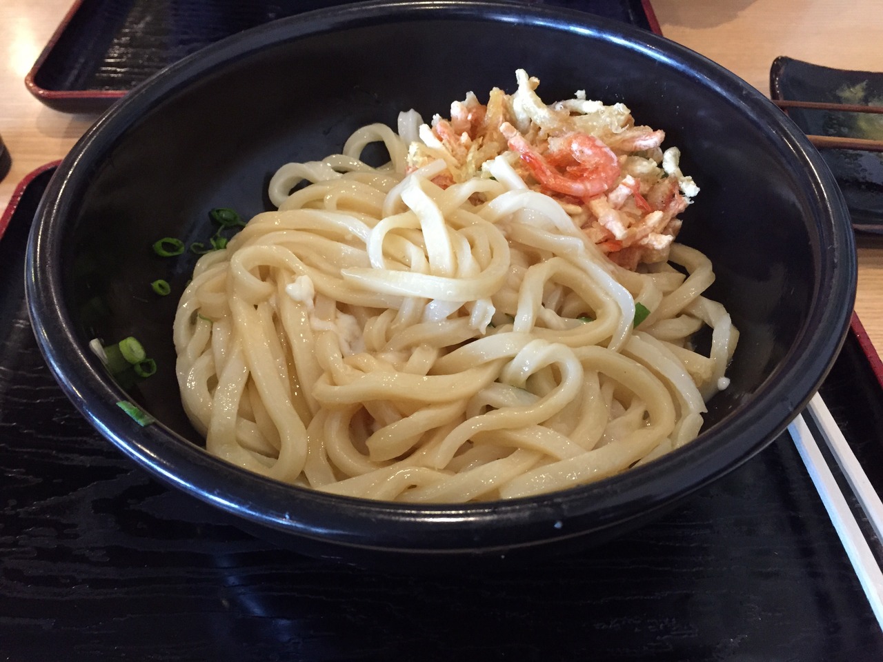 テレビで紹介されたところということで、行列ができ、待たされるのでは?と、心配は杞憂。10:30とちょっと早かったせいか、客もまばら。ぶっかけに海老かき揚げをトッピングにしてみた。もちろんぶっかけは暖かい麺。気候が良かったので半屋外で頂けました。