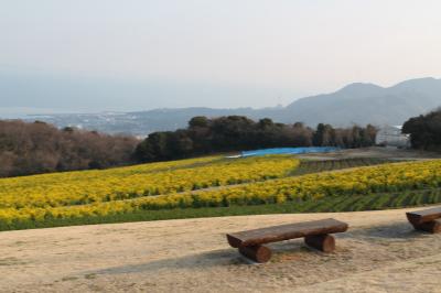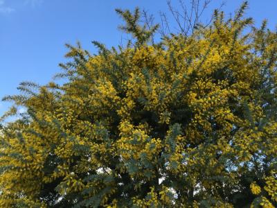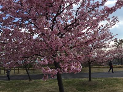 チューリップにはまだ早いが、河津サクラは満開で、ミモザとのコントラストが美しい。- 旅行時期