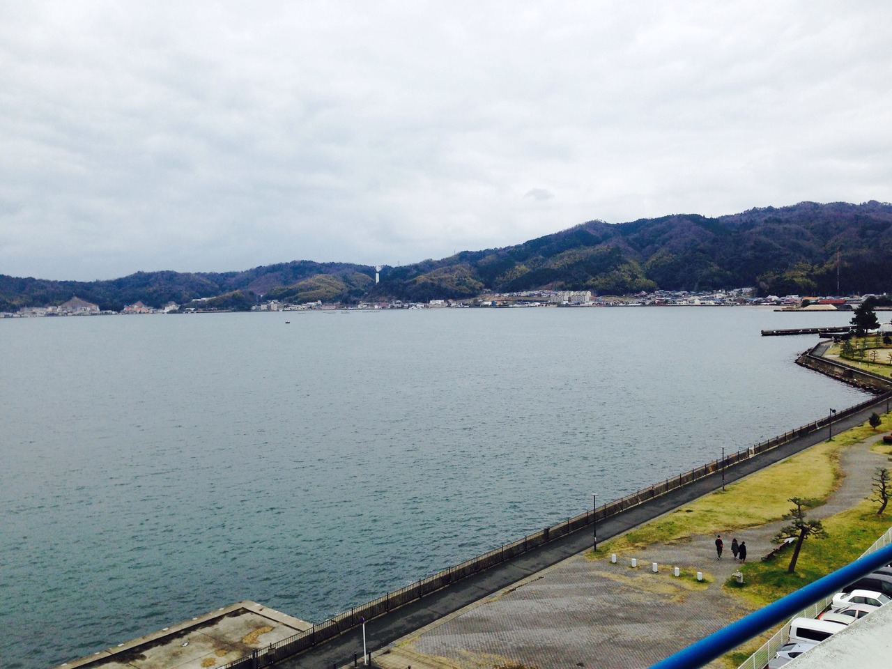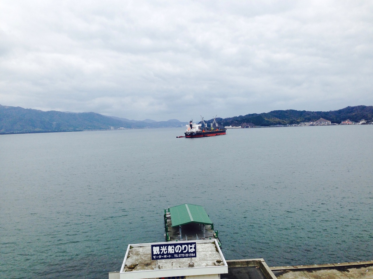 展望デッキがあり、宮津湾が一望できる。海、山、天橋立、船。