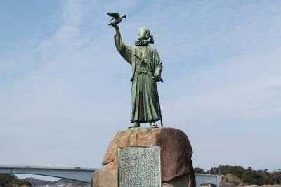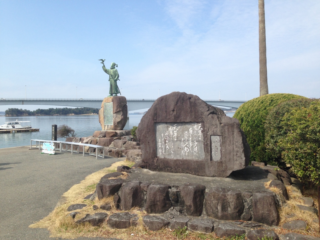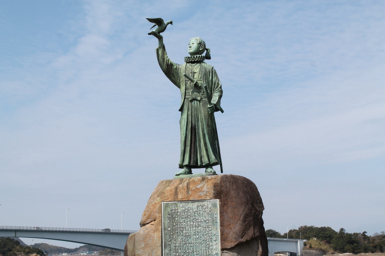 天草パールセンターのすぐ隣に橋をバックに17歳の天草四郎像が立っている。