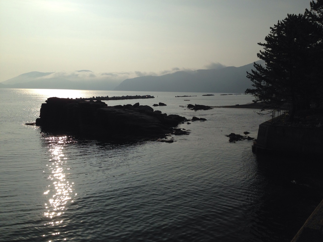 左にハンドルを切ると遠くに海と山が重なってみえる。