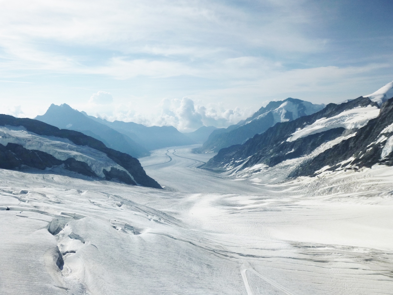 おなじみユングフラウヨッホに三度来たくてたった一人でやって来たら、嬉しいことにまたまた好天でした。プラトーに出て、360度の景観を楽しむ。ここからは一番の光景はアレッチ氷河方面だと思う。メンヒやユングフラウの山は、ゲレンデに出て、メンヒ小屋の方へ少し歩いて行くのが一番です。