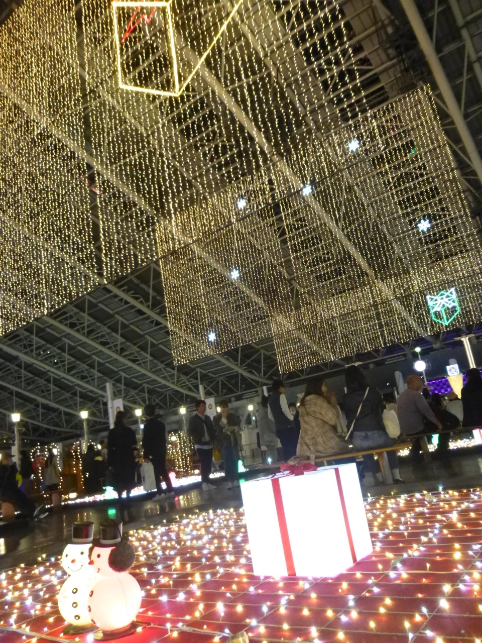 延々と長く広いイルミネーションもいいけれど、ここの様に駅の屋上通路部分の広場を瀟洒に飾って見物させてくれるのも嬉しい。こじんまりしているから人ごみもそれほどはないし。お花畑風もきれいにしてあって、上からのカーテン電飾もなかなかのものでした。