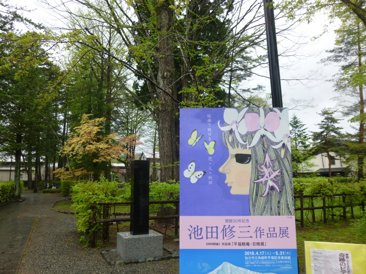 平福穂庵(ひらふくすいあん)という角館出身の明治初期日本画壇で活躍した画家の名前を付けた公立美術館です。角館の武家屋敷桜の名所の入り口付近にある。ちょうど木版で可愛い子供と花をモチーフにした絵の池田修三展を開催中であった。肝心のしだれ桜は見事に葉桜だったし、雨降りだったので、建物・周囲もきれいなこの美術館に入った。桜以上に可愛い版画を見たのがある意味救いだった。