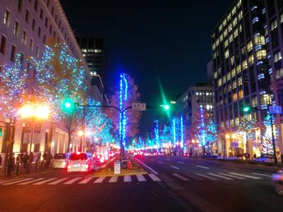 梅田から難波までほぼ地下鉄の駅の間隔で、銀杏の木等へのイルミネーションの色を変えていると聞いて、それならと梅新から難波までタクシーで走ってみた。黄色・青・赤・白などの色が次々代わって綺麗だった。でもやっぱり淀屋橋近辺でみるのが一番きれいだったと思う。