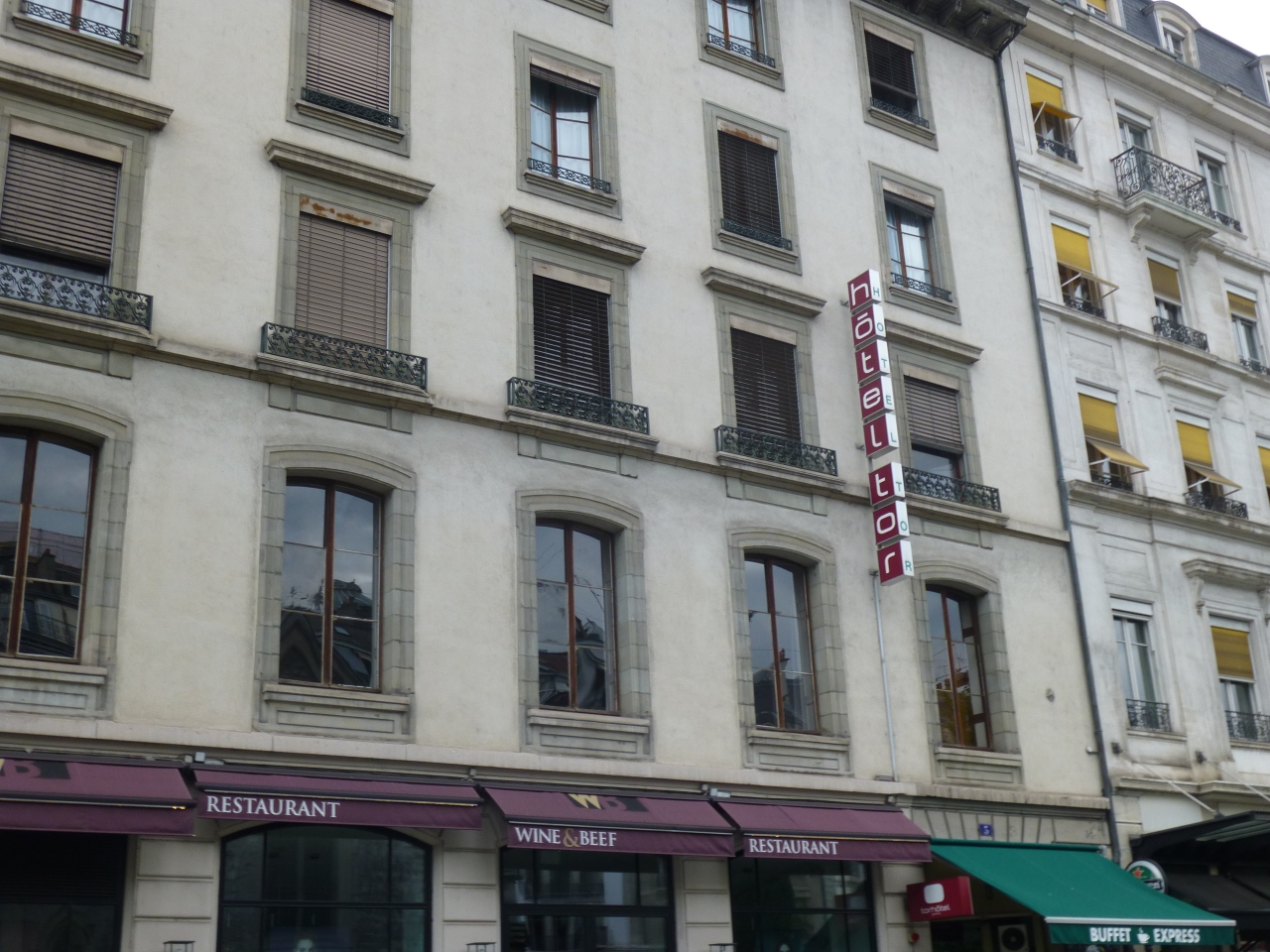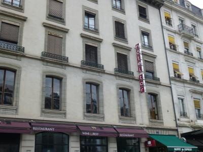 ジュネーブ中央駅に地下道で直結、ホームまで3分、COOPは1分、モンブラン通りの真横、シングルで予約した部屋は大きなキングサイズベッドで部屋は広くて清潔、ベランダから大噴水が見える。チェックインの3日前、ベルナーオーバーランドへの2泊の旅行の出る前に大きなスーツケースを預かってくれるかと聞きに行ったら「持っておいで」と気持ちよく。朝食時間前の朝早い出発の日には、「クロワッサンとコーヒーでも持って行きなさいよ」と6時半にサービスしてくれたし。