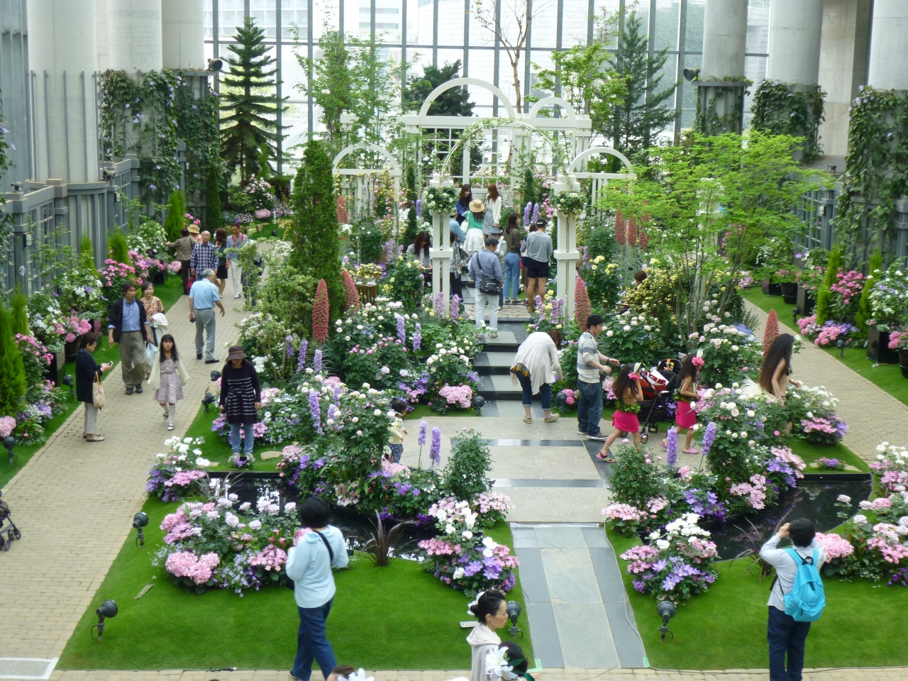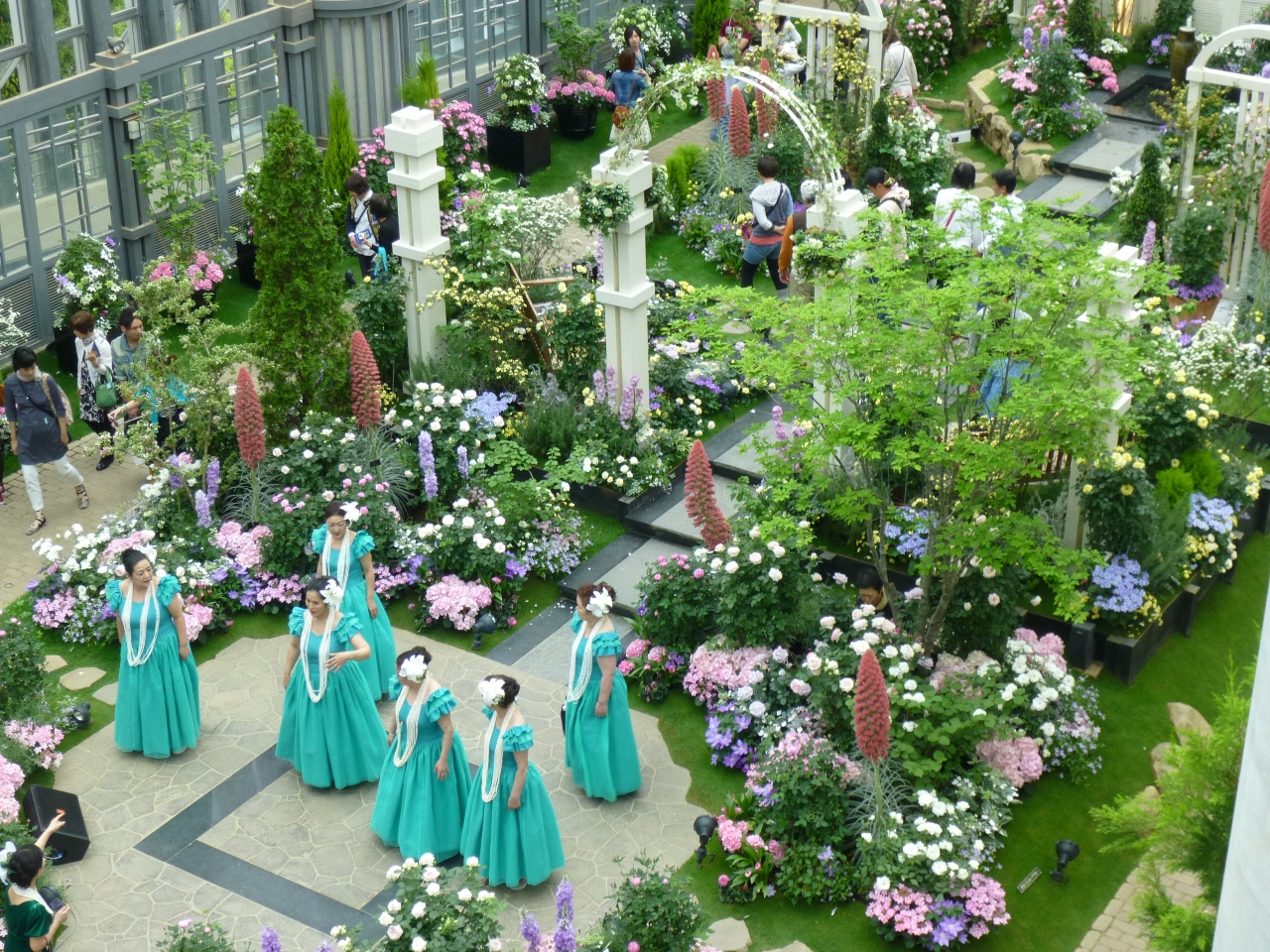 入場して上から見る温室内の景色に圧倒される。それにしてもうまいこと設計してある。温室の花壇を天井近くの回廊から見させるなんて。もちろん下に行って園内を散歩すると花々が生き生きと最盛期に保たれているのが実感できる。センスのいいデザインと管理の良さにはほんとに感心する。下手な音楽もかけていないし。たまたまその日はこの中でフラショーが行われていたのもよかった。