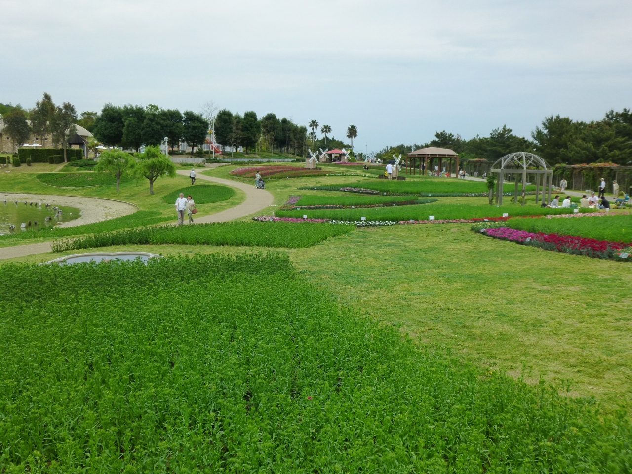 なんとも上手に配置した種々の色の花々。そんなにアップダウンなしだからいつまででも散策していたい。海も空も建物も木々もなんともマッチして。こんなに気持ちのいい公園があるのなら淡路に移住しようか?、なんて冗談も出て・・・。でも春だからなんでしょうね、こんなに気に入ったのも。