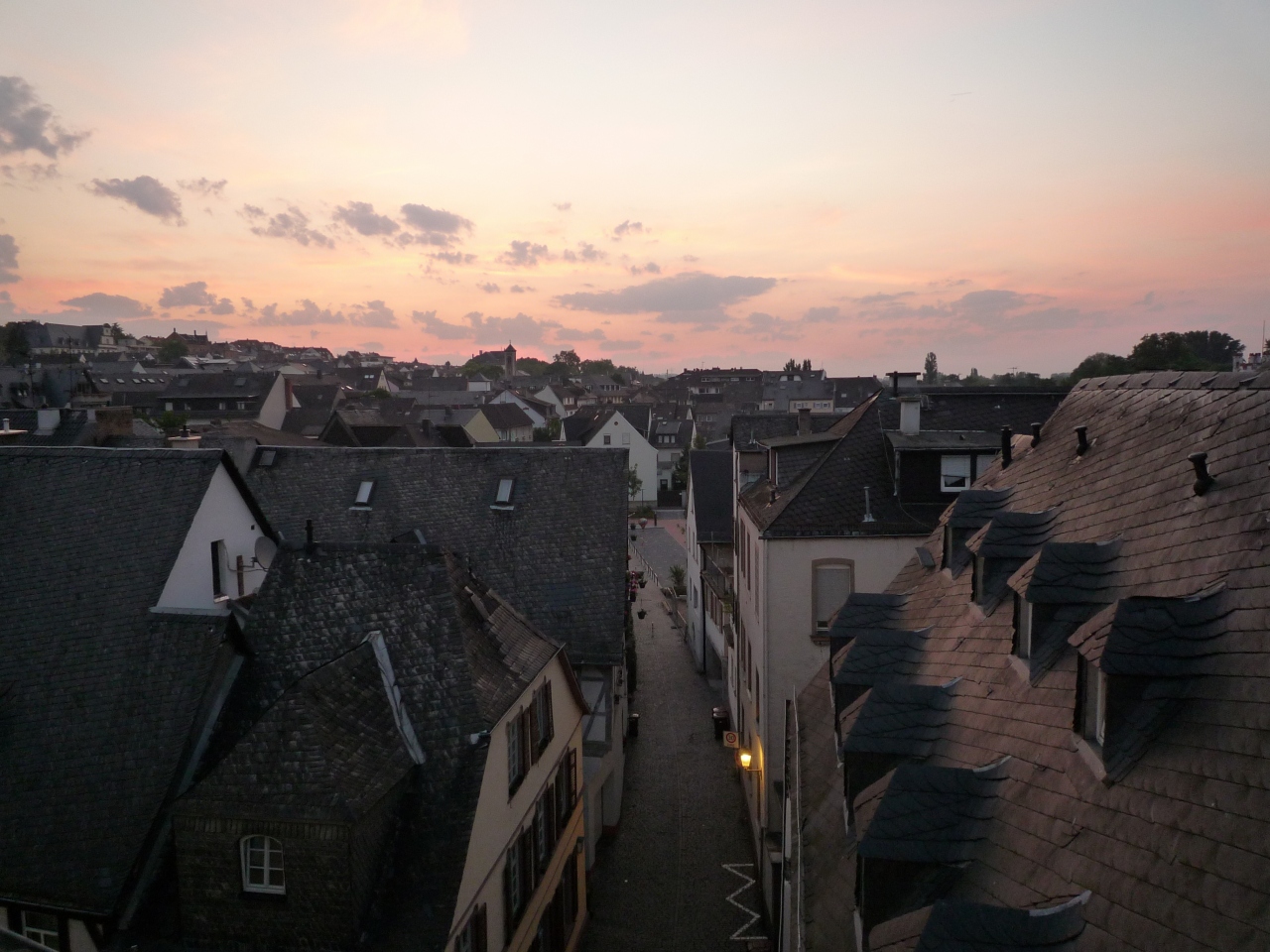 ドイツでの第一泊目。船着き場の前のホテル。部屋からの古い町の屋並みが見事。朝は小鳥や教会の鐘の音が聞こえ、朝日が昇ってくるのを部屋から鑑賞。ラインが朝焼けする。