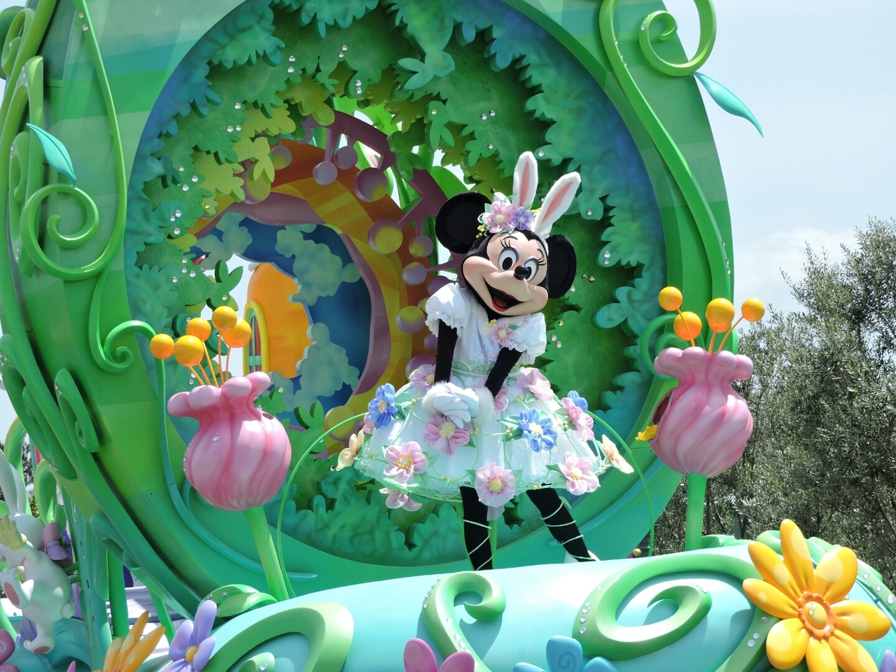 ランドの春のイースターのショー、ヒッピティホッピティスプリングタイムはカラフルなフロートでみんな春らしい衣装で登場します☆うさ耳をつけたキャラクターがいちいちかわいいです(*^^*)中でもミニーちゃんは可愛すぎてヤバイです!