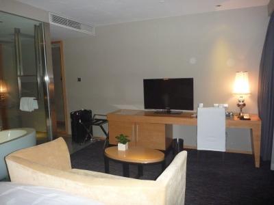 青島中心地より少し離れているが、空港から直通バスでホテルまでたどり着ける。またバスの発着地が隣のビルなので便利です。ショッピングセンターはホテルの前に位置しています。海も徒歩で行けるのでとても便利です。