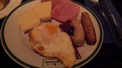 朝食はパン・チーズ・ハム数種、目玉焼き、ゆで卵とジュースとコーヒー。