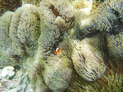 一度浜辺に上がって歩いていると、妻が葉っぱに擬態しているカマキリ発見...