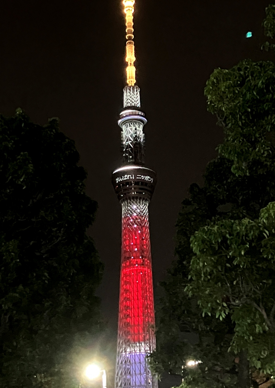 7/27 22:00~24:00は、パリ2024オリンピックでTEAM JAPANをイメージした特別ライティングを点灯