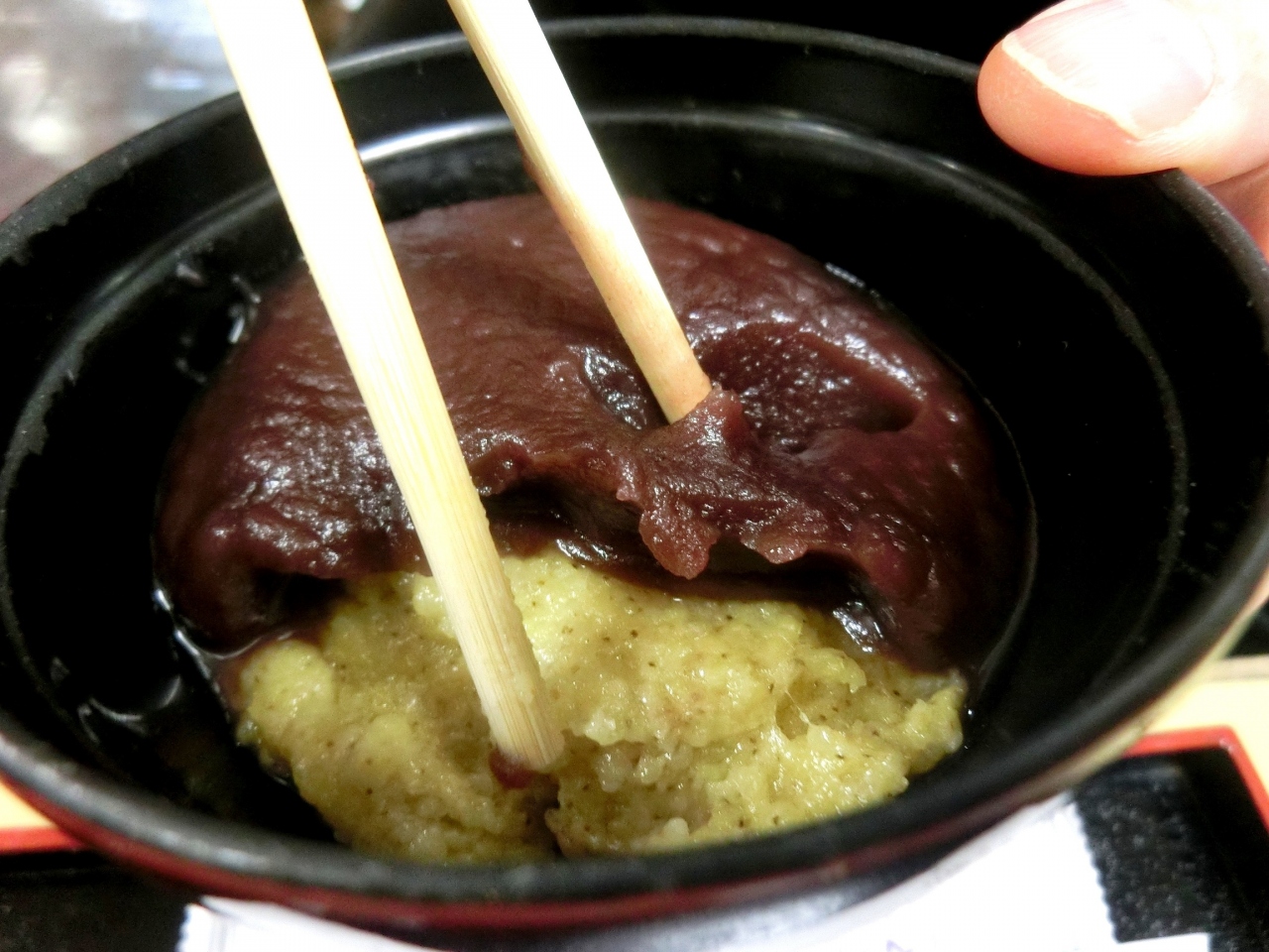 ※現在は美味しさのバランスを考えて素材を選び“餅きび”というミネラル豊富な穀物が使われ、蒸した餅と合わせてもちっとした食感に上品な甘さのこし餡をかけて頂きますw