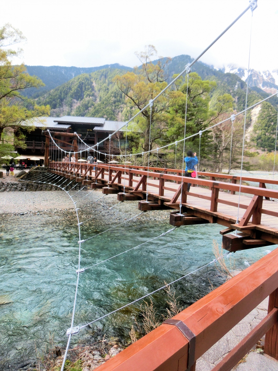 上高地バスターミナルから梓川沿いに歩いていくと5代目の吊り橋“河童橋”があります。