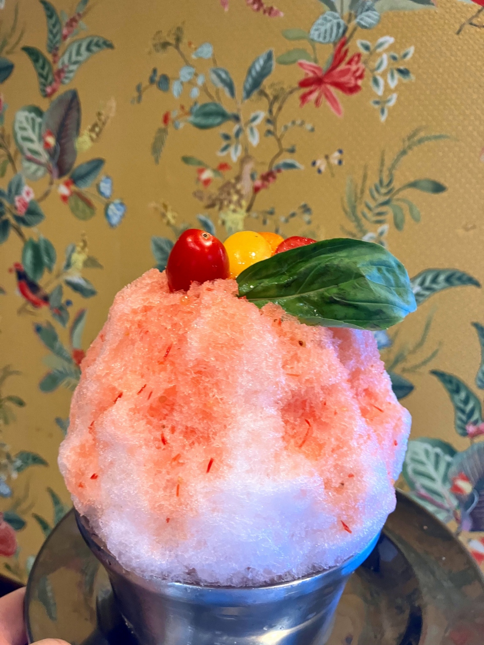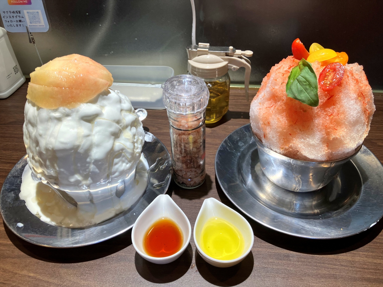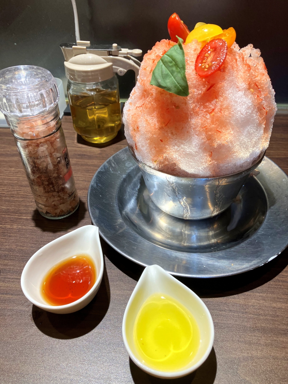 かき氷にオリーブや塩をかけながら食べるとgood!