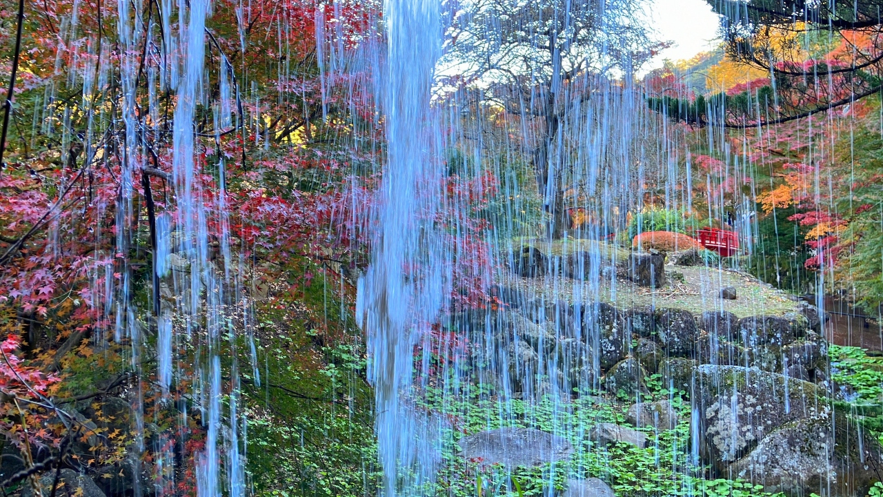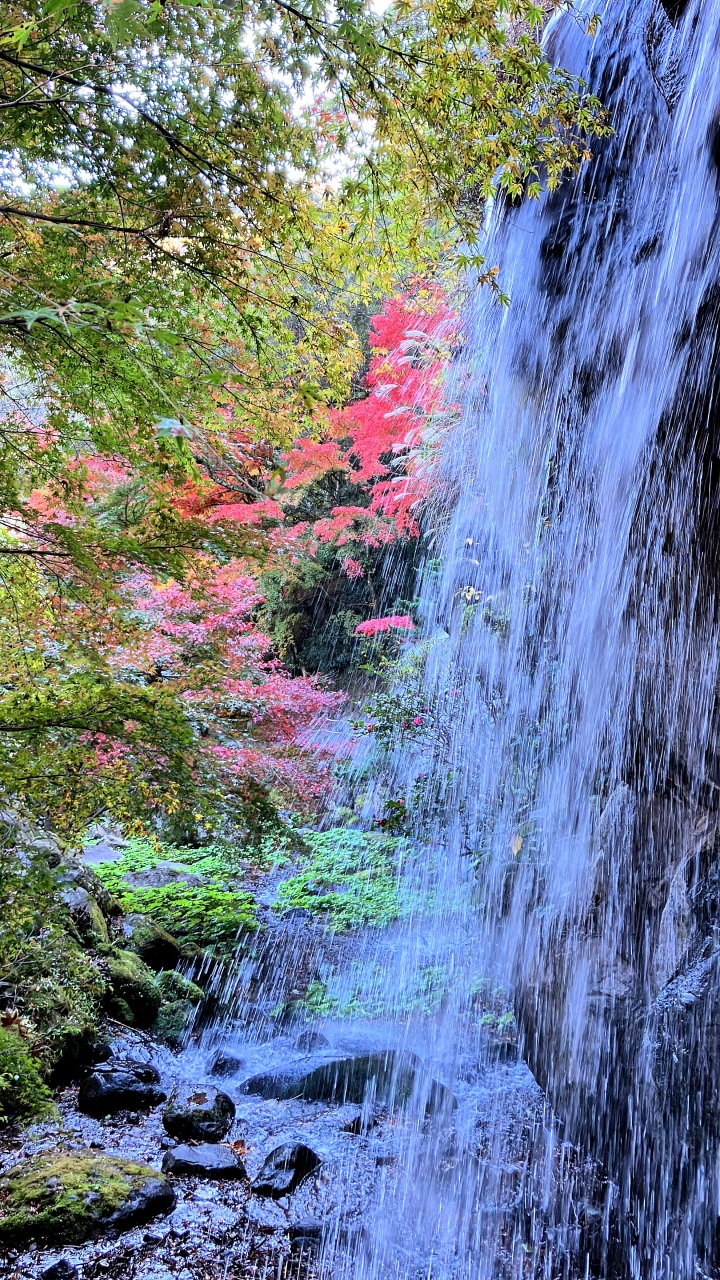 「梅見の滝」では流れ落ちる滝の内側からも赤く色づいたイロハモミジや楓を眺めることができますよー