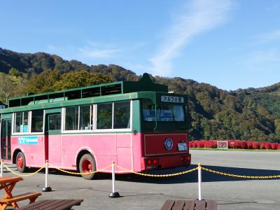 登山帰りに利用する人も多いので、大きなリュックを置く棚があります。武蔵五日市駅からつるつる温泉行きバスで行きました。乗車したのは、可愛い機関車のバスでした。時間によって、普通のバスのこともあるようです。