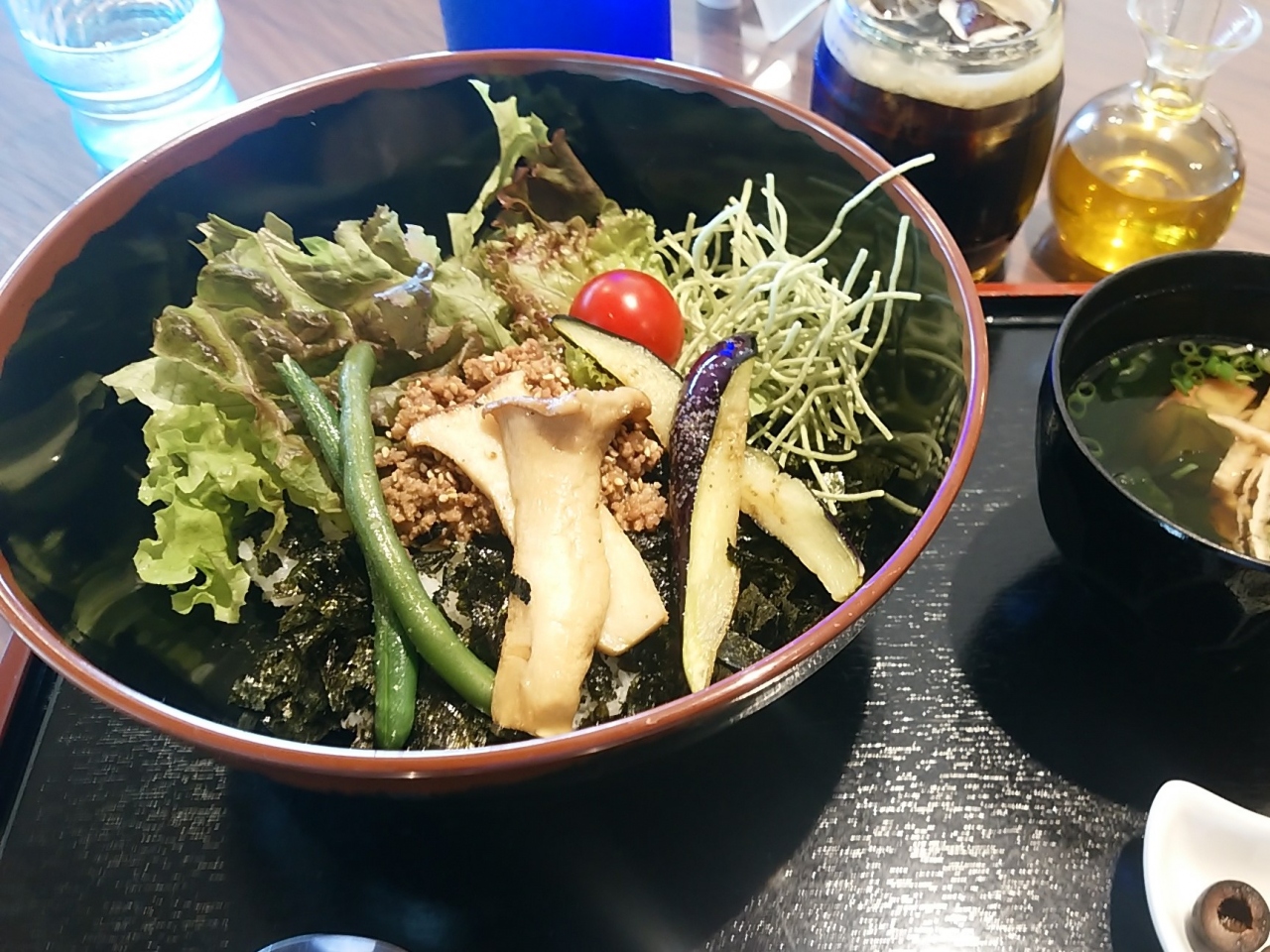 お昼ご飯、ひしお丼と素麺の膳をそれぞれいただきました。オリーブ園の高台にあるレストランは、明るいガラス張り。ゆったりとセティングされた座席からは、瀬戸内海を遠くまで見渡せました。入口前にはデッキ席もありました。店員の女性は朗らかで感じ良く、お店の雰囲気に合っていると思いました。