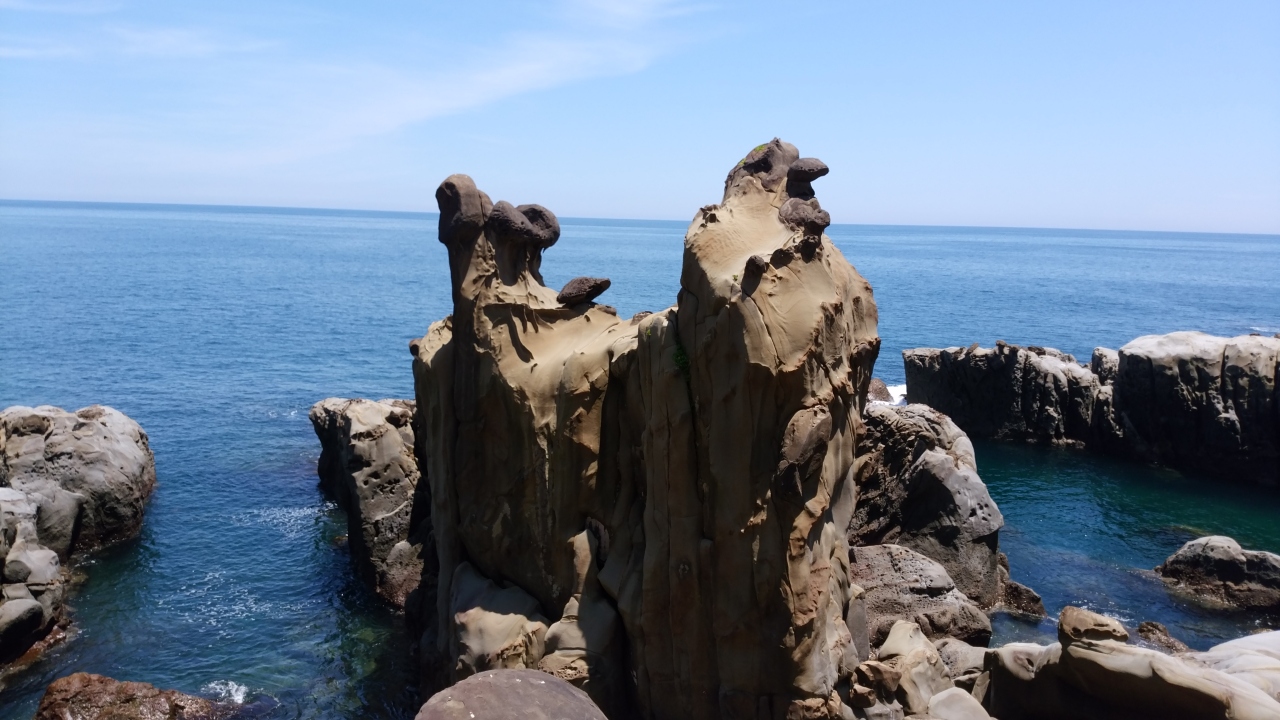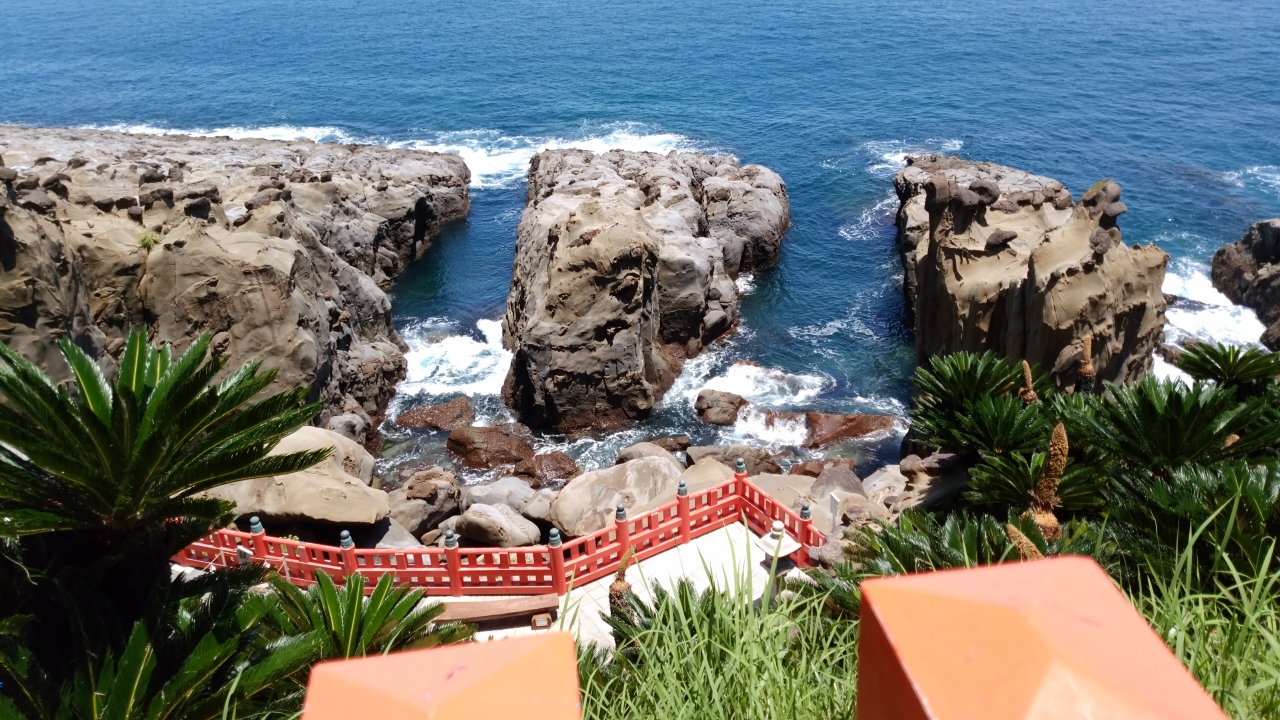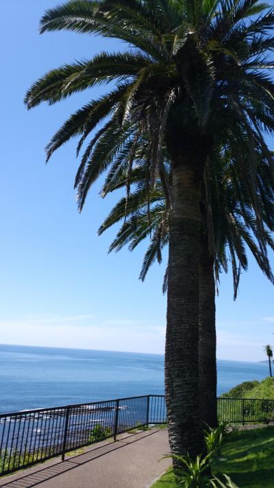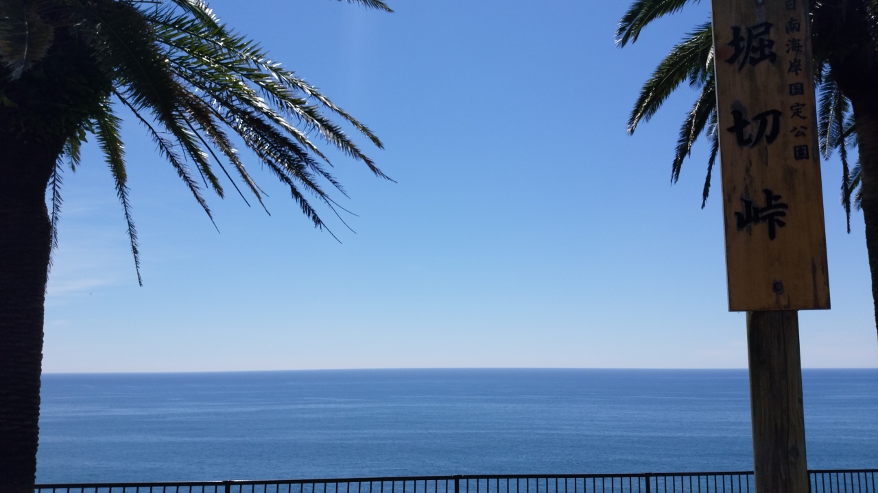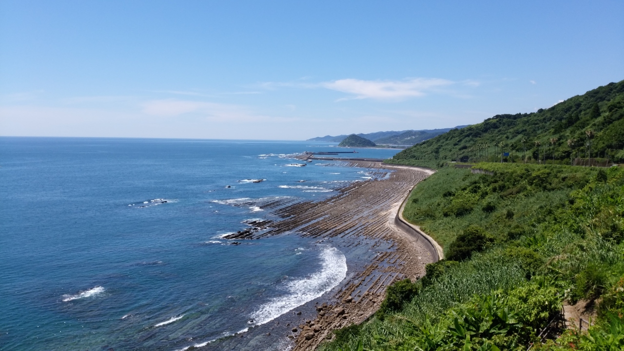 日南海岸のドライブ中、駐車スペースに停めて展望所へ。背の高いフェニックスが立っていて、ベンチに腰を掛けてスケッチをする人に出会いました。正面には、ただただ太平洋の海が広がっている素晴らしい景色。眼下には、青島だけのものと思いこんでいた「鬼の洗濯板」がありました。