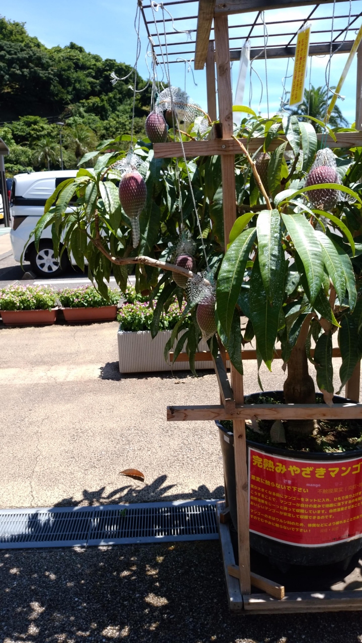 駐車場にレンタカーを降り歩き出すと、物産館の手前にネットを被ったマンゴーの実の生った木が「宮崎完熟マンゴー・果実に触らないで下さい」の張り紙と一緒にありました。マンゴーの木はうるし科なので、かぶれることもあるようです。