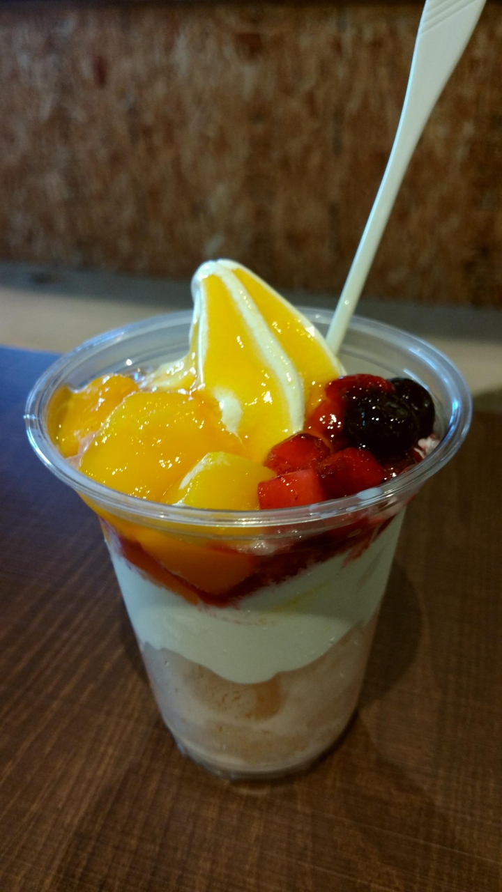 八丁坂を下りきったところ、神門の前にカフェがあるのを横目で確認して、参拝に向かいました。とても暑い日だったので喉が渇き、帰りに入店してクラッシュマンゴー630円をいただきました。カップの底まで冷たいマンゴーがぎっしりで、食べごたえがありました。シュークリームも人気のようです。祝日で混んでいて、もう少し座席があるといいなと思いました。