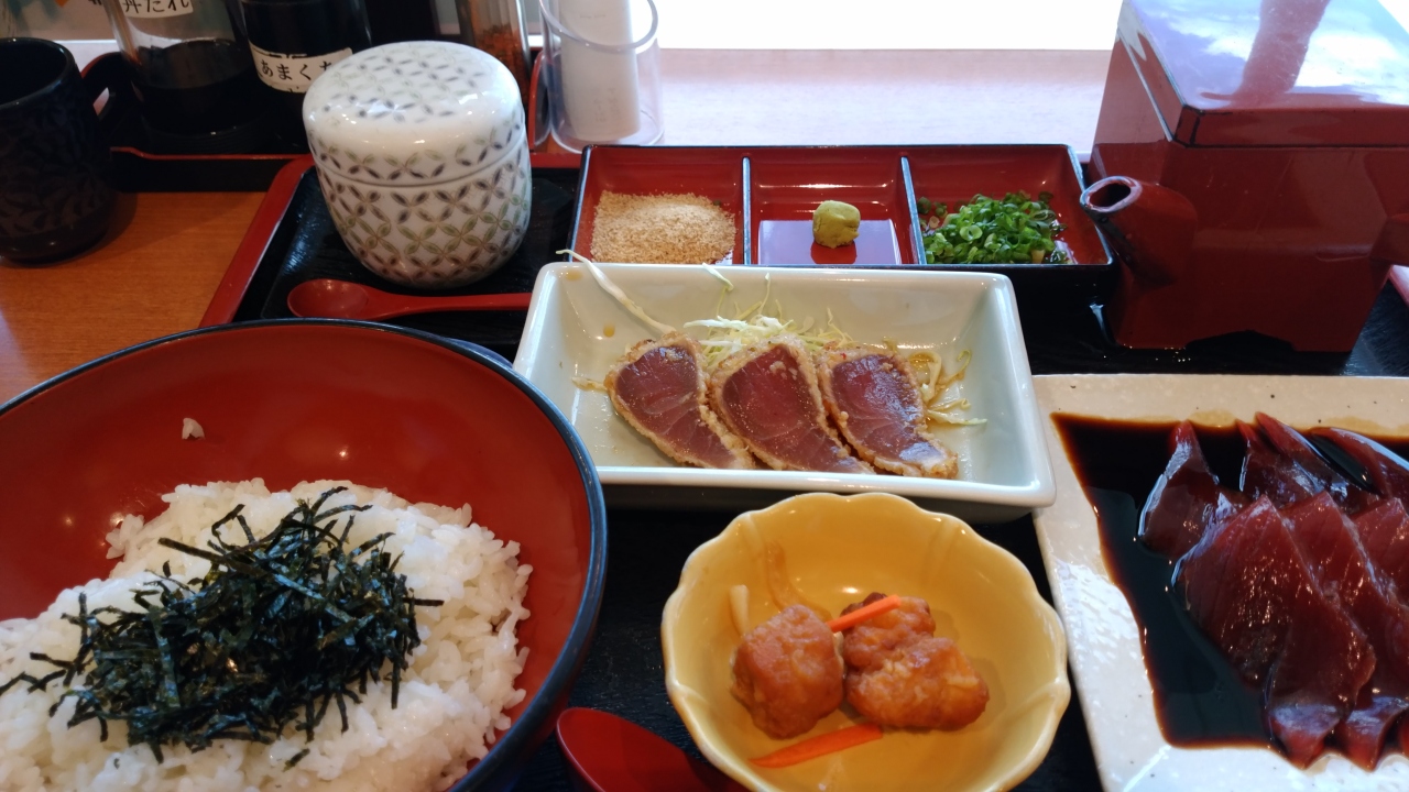 祝日、とても混み合っていて、40分程待って中に入ることができました。海側に向いたカウンター席へ案内され、かつおめし定食を注文しました。かつおの漬けをそのまま食べたり、ご飯に載せて出汁を掛けたりします。目井津漁港に面しており、時折出入りする漁船を見ながら、新鮮なかつおを美味しくいただきました。