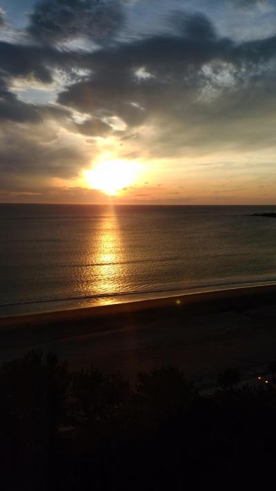 隔てるものが何もない水平線からの日の出は、とても美しく感動的でした。訪れた7月中旬は、広々としたビーチはまだ混雑もなく、サーフィンを楽しむ人もそれほど多くはありませんでした。ヤシが並び、おしゃれなカフェなどの飲食店も出店されて、リゾート感のある海水浴場です。